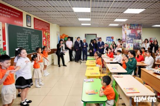 Nhân dịp này, Phu nhân Tổng Bí thư Tô Lâm đã trao tặng quà là những quyển sách, cuốn truyện tiếng Việt đến các em học sinh và ngồi cùng các em nhỏ, vỗ tay theo những điệu múa trên các bài hát về quê hương Việt Nam.