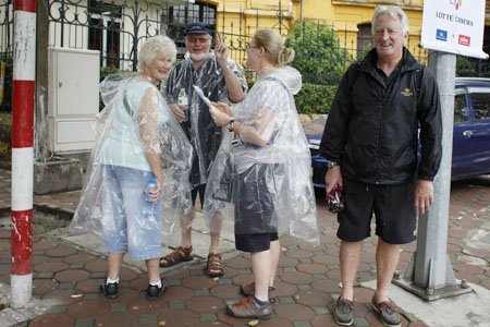 Những vị khách du lịch mặc áo mưa cho đỡ lạnh khi dạo phố Hà Nội