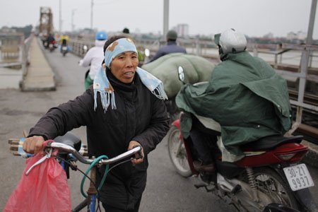Gió lộng trên cầu Long Biên, những người bán hàng ở đây đều phải mặc thêm áo mưa cho đỡ rét