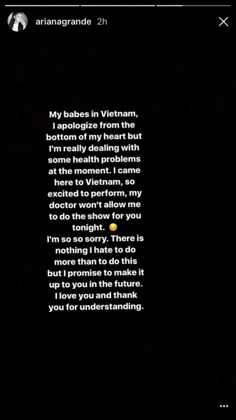 Chắc không cần kể lại thì ai cũng nhớ sự việc diễn ra vào ngày 23/8 vừa qua, khi chỉ cách giờ diễn vỏn vẹn 5 tiếng đồng hồ, Ariana Grande đột ngột đăng lên story Instagram của mình cáo bệnh và xin lỗi fan Việt Nam không thể diễn vào tối ngày hôm đó. Ngay lập tức, dòng story ấy có sức sát thương trực tiếp đến hàng nghìn khán giả đã mua vé tham dự Dangerous Woman Tour tại TP HCM và có lẽ sự kiện trên sẽ là một trong những “cột mốc đáng nhớ” với khán giả Việt Nam.