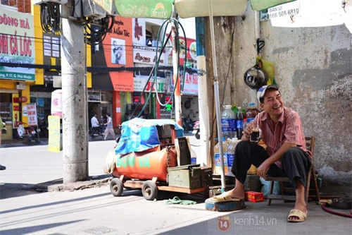 Anh Hùng (SN 1967) làm nghề vá xe ở đầu hẻm và kiêm luôn việc trông coi bình nước miễn phí. Hằng ngày, anh vá xe miễn phí cho rất nhiều người khuyết tật.