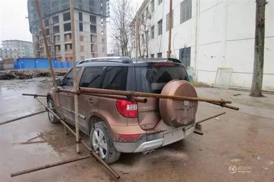 Vì quá tức giận, nhóm công nhân này đã sử dụng 12 thanh sắt giàn giáo để ‘khóa’ chiếc xe Skoda SUV của ông chủ lại, họ còn tháo hơi xe để hòng chủ chạy trốn.