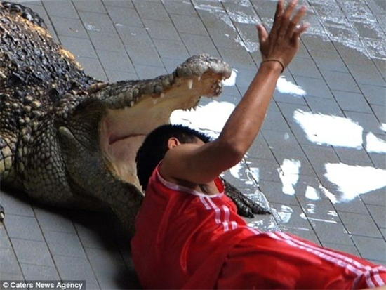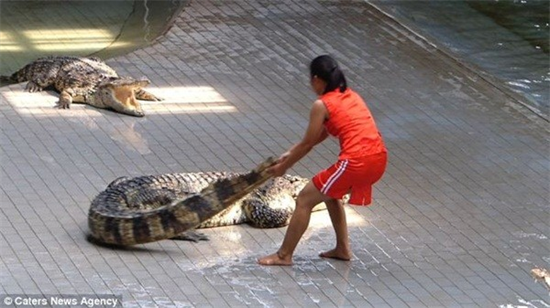 Không ngần ngại đặt đầu mình vào hàm cá sấu rồi kéo con vật đi trước sự chứng kiến của du khách là công việc hàng ngày của những huấn luyện viên cá sấu làm việc tại khu nuôi dưỡng cá sấu Pattaya ở Thái Lan. Nhiều người còn hôn vào chóp mũi cá sấu để khiến khán giả thêm thích thú.