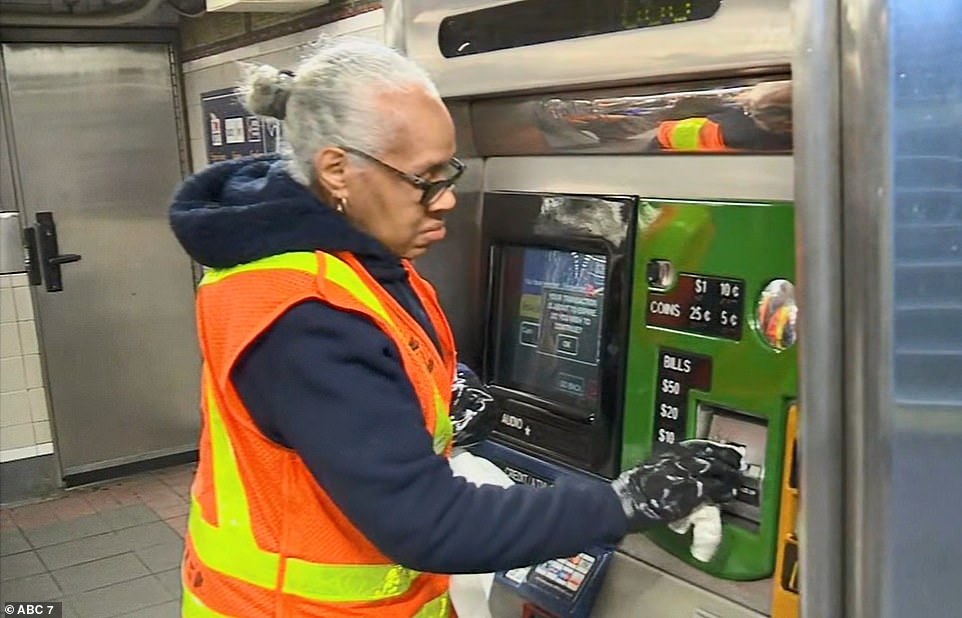 Nhân viên vệ sinh làm sạch, khử trùng các toa xe điện ngầm tại New York City. Ảnh: ABC.