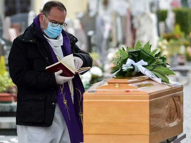 Một linh mục mang khẩu trang cầu nguyện cho một người vừa qua đời ở một lễ tang tại nghĩa trang TP Bolgare, vùng Lombardy (Ý). Ảnh: AFP.