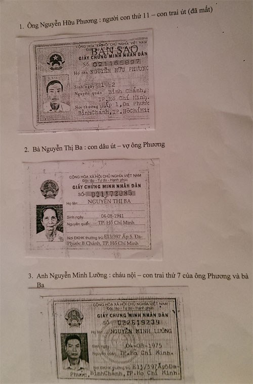 Ngoài ra, phải có bản photo CMND của con trai út, con dâu út, cháu nội của cụ. (đính kèm bản chụp photo các CMND con trai, con dâu, cháu nội hiện tại đang sống chung với cụ).