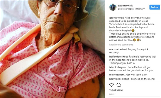 ''Xin chào các bạn. Chúng tôi dự định sẽ có một kỳ nghỉ ở Great Yarmouth, nhưng không may, Pauline đã bị ngã ở nhà, khiến vỡ hông và gãy vai. Hiện bà ấy đang nằm ở bệnh viện. Đã 3 ngày rồi. Bà ấy cũng đã khá hơn và nhờ tôi gửi lời chào và tình yêu đến tất cả mọi người''