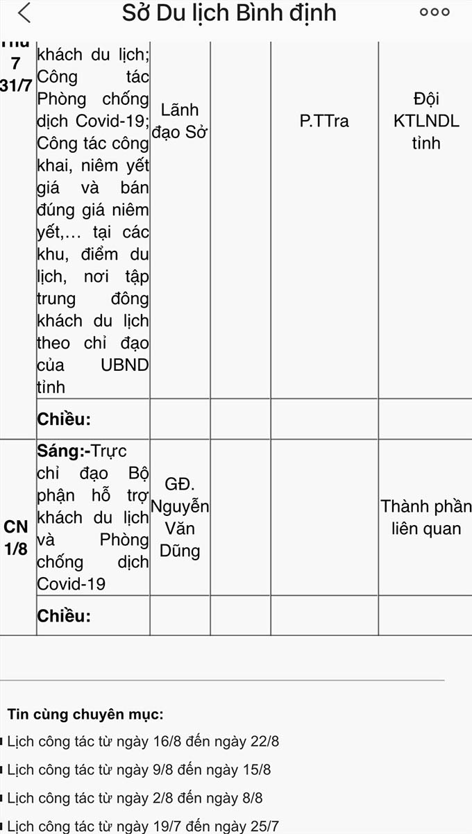 Trang web của Sở Du lịch Bình Định tại địa chỉ https://sodulich.binhdinh.gov.vn/view/801 lưu chi tiết lịch công tác của lãnh đạo Sở. Chiều 19.8, truy cập trang này, phóng viên không tìm thấy nội dung khảo sát sân golf như ghi trong giấy mời của Trung tâm Thông tin - Xúc tiến du lịch Bình Định. Theo đó, chủ nhật, 1.8, buổi sáng Giám đốc Nguyễn Văn Dũng trực chỉ đạo bộ phận hỗ trợ khách du lịch và phòng chống dịch COVID-19. Cột buổi chiều bỏ trống.