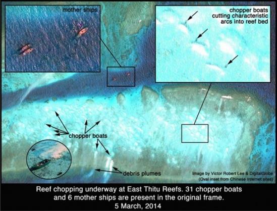 Giáo sư sinh học hải dương của Đại học James Cook ở Australia, ông Terry Hughes, mới đây còn trưng ra những bằng chứng là các hình ảnh chụp từ vệ tinh cho thấy sự phá hoại chưa từng có đối với các rạn san hô ở Biển Đông mà thủ phạm không ai khác là Trung Quốc và lực lượng ngư dân nước này.