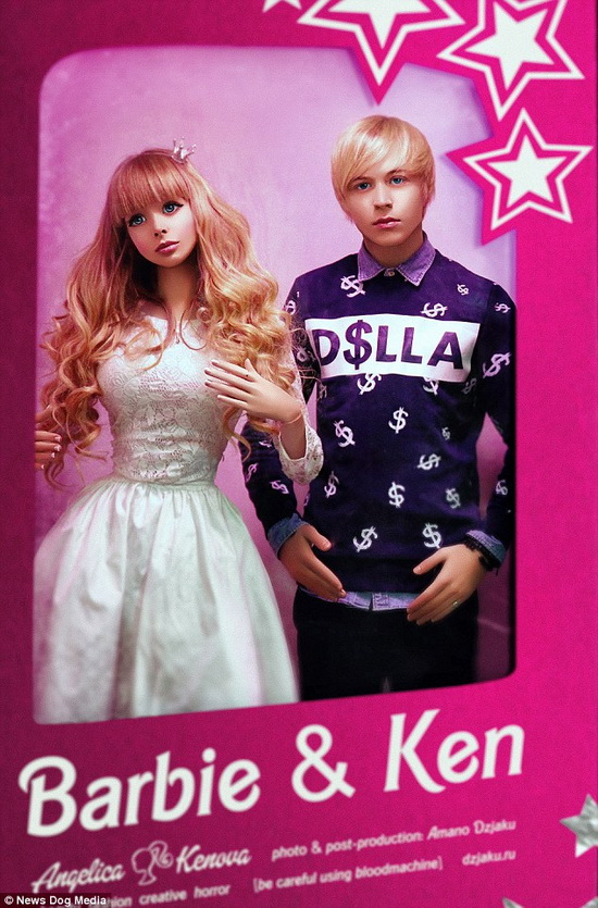 Angelica trong tạo hình búp bê Barbie, chụp cùng nam người mẫu hóa thân thành búp bê Ken. (Ảnh: dailymail)