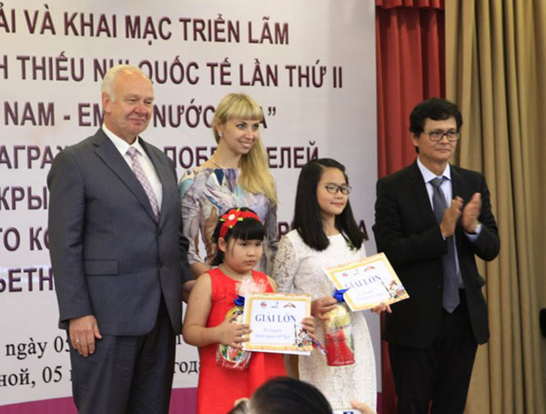 Hai em đoạt Giải Lớn của Cuộc thi lần thứ hai chụp ảnh chung với Chủ tịch Hội Hữu nghị Việt - Nga Trần Bình Minh, Đại sứ Nga tại Việt Nam K. Vnukov, Giám đốc Trung tâm KH&VH Nga tại Hà Nội N. Shafinskaya.