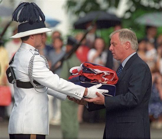 Thống đốc cuối cùng của Hong Kong thuộc Anh Chris Patten nhận lại lá cờ Anh sau khi nó được hạ xuống tại dinh thự của ông vào chiều 30/6/1997. Ảnh: AFP.