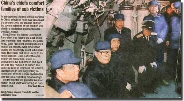 Bức ảnh chụp các quan chức cấp cao của Hải quân Trung Quốc cùng thân nhân của các thủy thủ hy sinh trên tàu 361. Con tàu nhìn vẫn còn nguyên vẹn. Chính điều này khiến nguyên nhân chìm tàu càng là một bí ẩn.