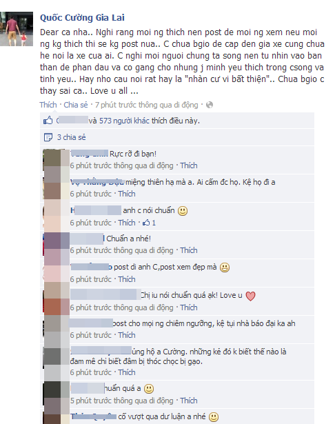 Anh viết:"Dear ca nha.. Nghi rang moi ng thich nen post de moi ng xem neu moi ng kg thich thi se kg post nua.. C chua bgio de cap den gia xe cung chua he noi la xe cua ai. C nghi moi nguoi chung ta song nen tu nhin vao ban than de phan dau va co gang cho nhung j minh yeu thich trong csong va tinh yeu.. Hay nho cau noi rat hay la "nhàn cư vi bất thiện".. Chua bgio c thay sai ca.. Love u all ...".