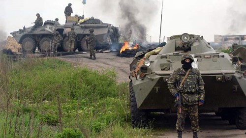 Binh sĩ Ukraine gác ở một điểm chốt chặn khi họ tấn công vào thành phố Slavyansk hôm 2/5.