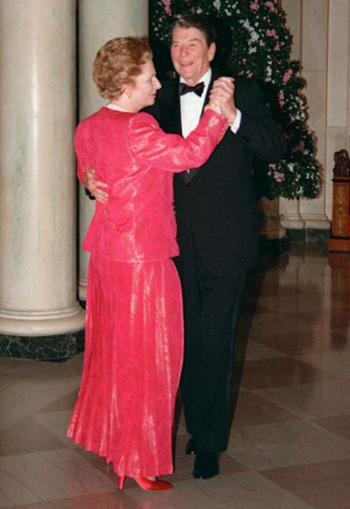 Bà Thatcher mặc váy đỏ và khiêu vũ cùng Tổng thống Ronald Reagan năm 1988.