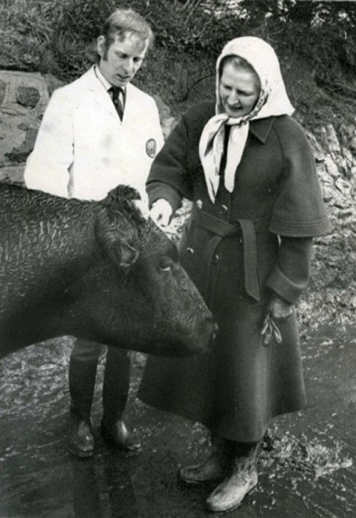 Hình ảnh hiếm hoi về Thatcher không mặc những "bộ váy quyền lực" khi đến thăm một trang trại ở Cornwall.