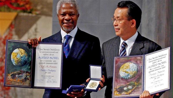 Ông Annan (trái) và Chủ tịch Đại hội đồng Liên Hợp Quốc Han Seung Soo nhận giải Nobel Hòa bình năm 2001. Ảnh: AAP.