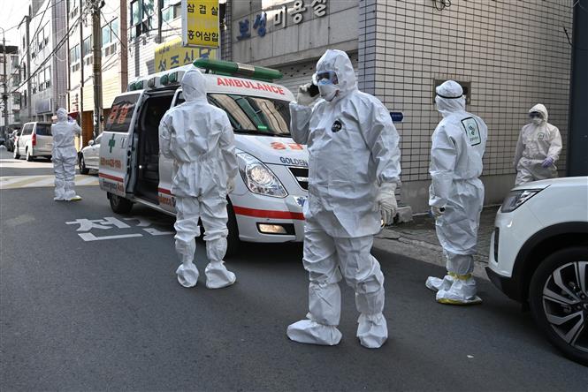 Nhân viên y tế Hàn Quốc làm nhiệm vụ tại một khu dân cư ở thành phố Daegu, nơi phát hiện các trường hợp có triệu chứng nhiễm virus SARS-CoV-2, ngày 27/2/2020. Ảnh: AFP/TTXVN