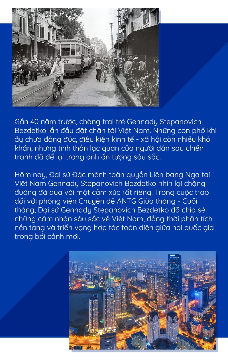Đại sứ Gennady Stepanovich Bezdetko: Đúng là công việc của tôi gắn bó mật thiết với Việt Nam. Vì thế, tôi đã có cơ hội tận mắt chứng kiến các giai đoạn phát triển khác nhau của đất nước các bạn.