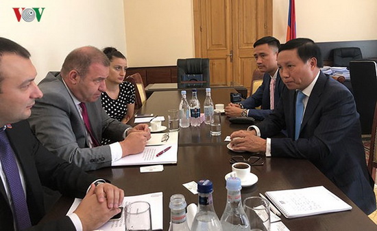 Đại sứ Ngô Đức Mạnh hội đàm với Phó Chủ tịch Quốc hội Armenia Mikayel Melkumyan (ngồi giữa, bên trái).