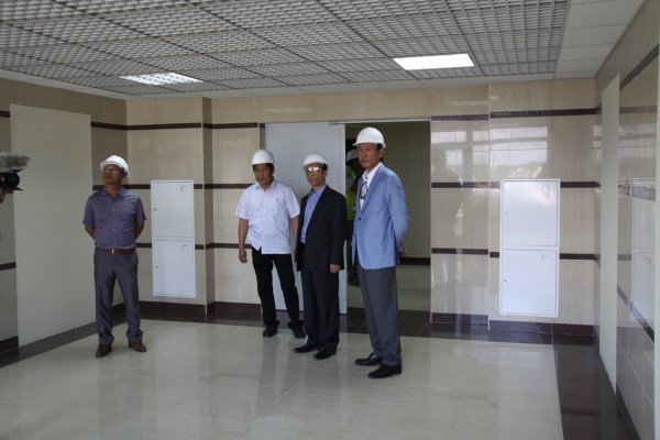 Đoàn công tác ĐSQ kiểm tra sảnh thang máy tại tầng 5 đã đuợc hoàn thiện