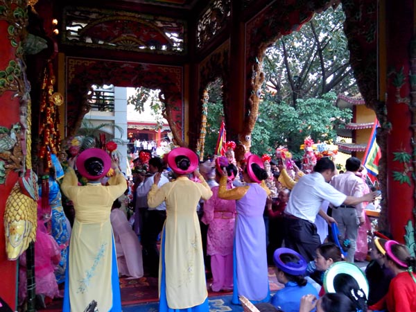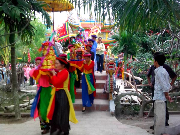 Các đoàn con nhang, đệ tử của "mẫu" The khiêng, đội, vác lễ vật dạo một vòng quang vườn "mẫu" trước khi dâng lên "mẫu"