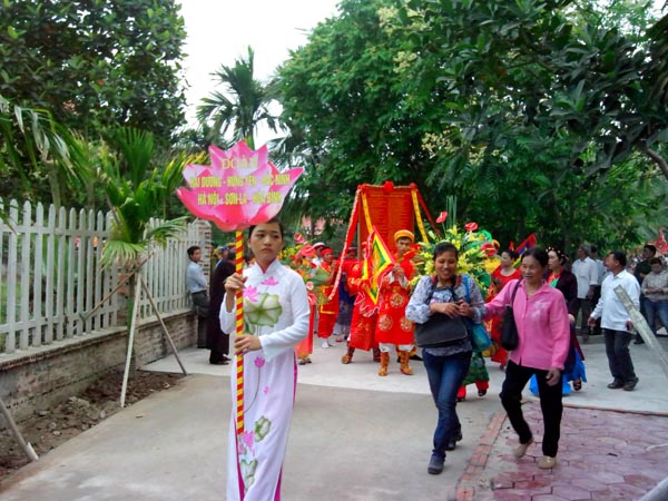 Trong ngày “hiếu mẫu” năm nay, hàng nghìn thiện nam, tín nữ của “mẫu” xếp hàng đôi khiêng, đội, vác lễ vật của mình “dạo” một vòng quanh khu “vườn mẫu” rộng hàng hec-ta vẫn đang được đầu tư xây dựng rất hoành tráng trên đất nông nghiệp trước khi dâng lễ vật lên “mẫu” tại “Thượng tòa thiên thánh”.
