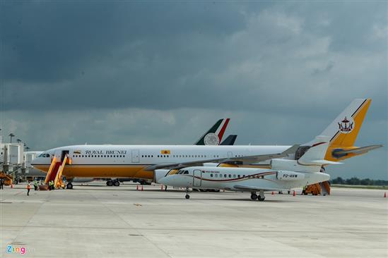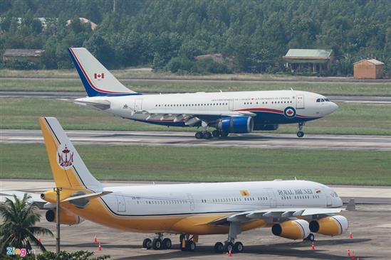 Phi cơ Airbus 340-212 được ví von là "cung điện bay" của Quốc vương Brunei Hassanal Bolkiah. Bên trong phi cơ này được thiết kế lại theo phong cách hoàng gia với nội thất làm bằng gỗ quý, phòng tắm dát vàng cùng phòng ngủ sang trọng. Đặc biệt, Quốc vương Hassanal Bolkiah tự tay lái chuyên cơ này đến Đà Nẵng tham dự APEC. Bên cạnh là chuyên cơ của Thủ tướng Papua New Guinea.