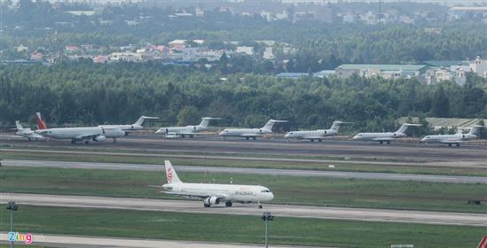 Chuyên cơ Airbus A312 (đậu thứ 2 từ bên trái sang) với lá cờ Philippines trên cánh đuôi đứng của Tổng thống Rodrigo Duterte, cùng các máy bay tư nhân của doanh nghiệp tham dự APEC.