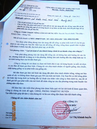 Công văn giới thiệu của Công ty TNHH TM&DV Nông lâm sản Hưng Yên gửi về các xã ở huyện Minh Hóa đăng ký mua giống cây sưa đỏ của công ty