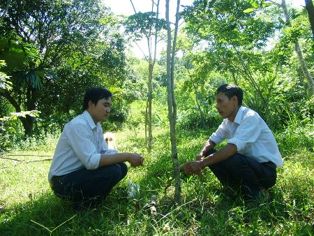 Ông Đinh Minh Dân (phải) là người đăng ký mua cây giống sưa đỏ nhiều nhất ở xã Xuân Hóa