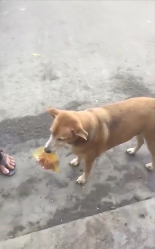 Trong đoạn clip, một chú chó màu vàng, miệng ngậm chặt túi thịt đứng cạnh người đàn ông trung niên sau đó lại chạy lon ton phía trước, chốc chốc dừng lại đợi người chủ đang đi phía sau đã kích thích sự theo dõi của cộng đồng mạng Việt