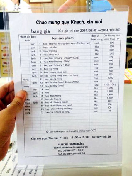 Khác với những lần trước, khi các bảng thông báo bằng tiếng Việt ở Nhật thường cảnh báo người Việt không được trộm cắp, không vứt rác, hút thuốc... thì lần này, một kho hàng đông lạnh ở thành phố Nagaoka tỉnh Niigata đã dán một bảng báo giá nội tạng lợn bằng tiếng Việt.