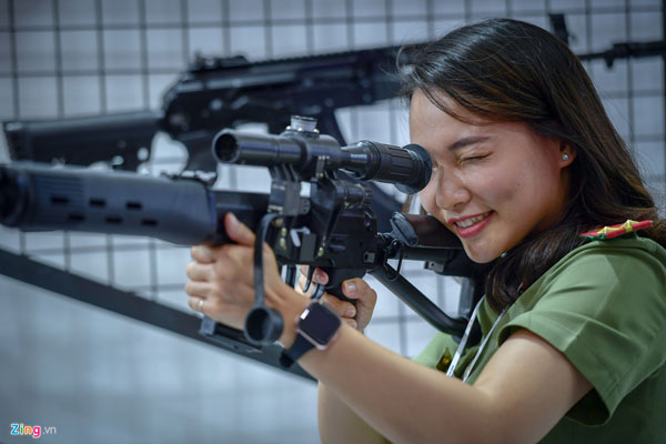 Gian hàng triển lãm của Bộ Công an Việt Nam bày một số loại vũ khí, công cụ hỗ trợ do Việt Nam tự chế tạo như súng bắn lưới, súng phóng quả nổ 3 nòng, găng tay bắt dao, mũ chống đạn...