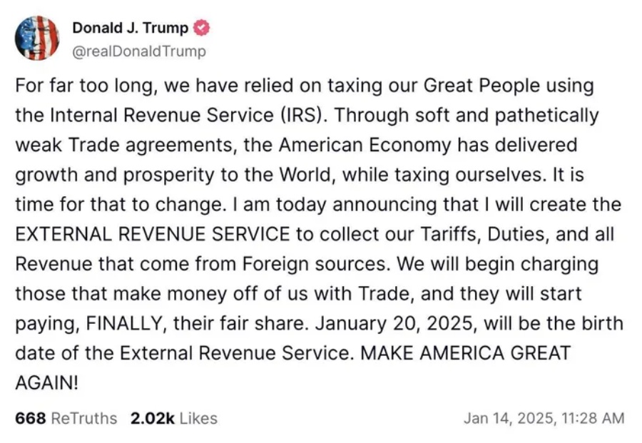 Ông Trump nói thêm: “Chúng ta sẽ bắt đầu tính phí đối với những ai kiếm tiền từ chúng ta thông qua thương mại, và họ cuối cùng sẽ bắt đầu trả phần họ phải trả. Ngày 20/1/2025 sẽ là ngày ra đời của Sở Thuế vụ Nước ngoài”.