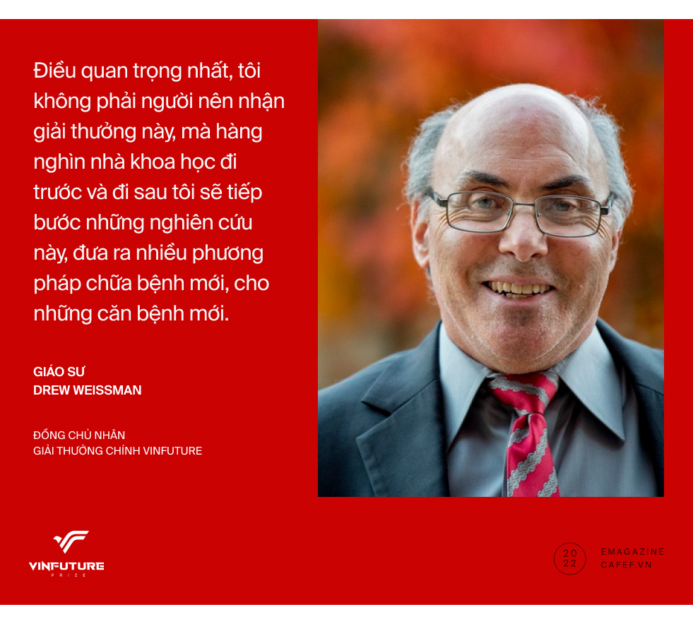 "Điều quan trọng nhất, tôi không phải người nên nhận giải thưởng này, mà hàng nghìn nhà khoa học đi trước và đi sau tôi sẽ tiếp bước những nghiên cứu này, đưa ra nhiều phương pháp chữa bệnh mới, cho những căn bệnh mới" - GS Drew Weissman, cộng sự của TS Katalin Kariko nói, mở ra hy vọng vào tương lai của VinFuture.