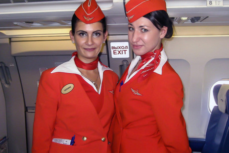 Hai nữ tiếp viên hãng Aeroflot Nga trong trang phục đỏ đặc trưng, với hình búa liềm trên mũ canô và ngực áo. (Nguồn: Airlines-inform)