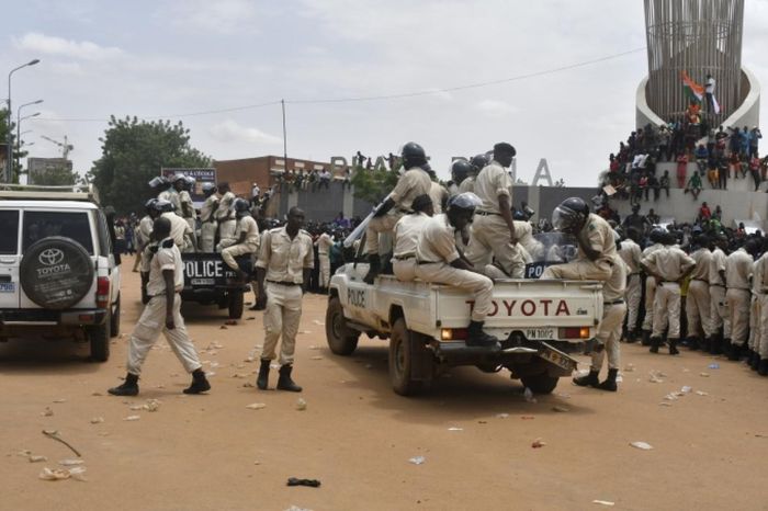 Cảnh sát Niger tại một khu vực người biểu tình tập trung để ủng hộ chính quyền quân sự ở Niamey ngày 30/7. Ảnh: AFP