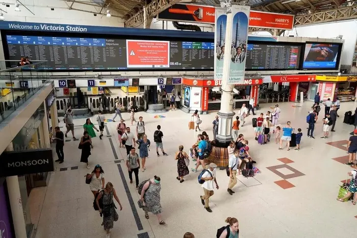 Du khách đi ngang qua bảng cảnh báo về sự gián đoạn do nắng nóng khắc nghiệt tại ga Victoria ở London (Anh) hôm 18/7. Ảnh: AFP.