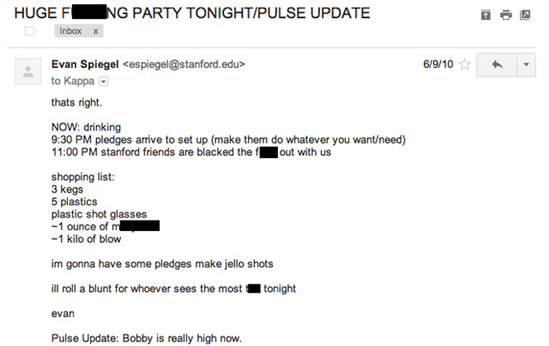 Nội dung email bao gồm các vấn đề về rượu bia, ma túy, sex, v.v... Chính những email này đã tiết lộ về quá khứ ăn chơi sa đọa của chàng sinh viên nhà giàu Evan Spiegel. Sau đó anh đã bị Đại học Stanford kỉ luật và anh phải xin lỗi vì những email thiếu chín chắn này.
