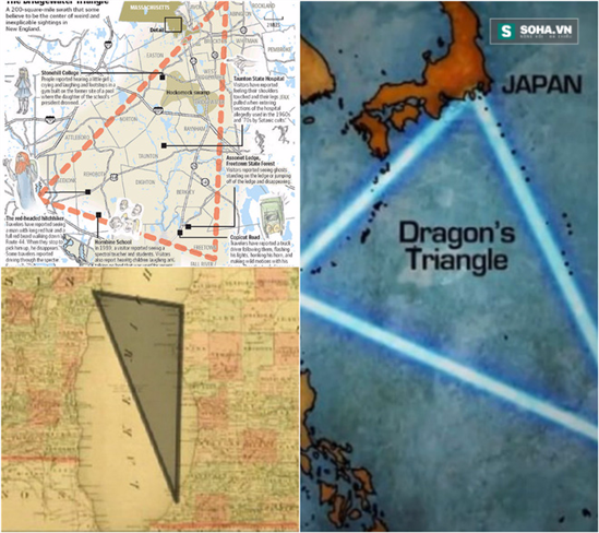 Các tam giác bí ẩn khác trên thế giới: Tam giác Rồng (ảnh phải, to), Tam giác Bennington (hình dưới, trái) và tam giác Bridgewater (hình trên, trái).