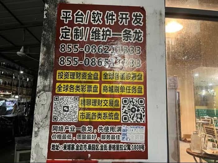 Những dạng quảng cáo kiểu này xuất hiện khắp thành phố. Các áp phích bằng tiếng Trung Quốc muốn tuyển dụng lao động “phát triển phần mềm”, “dịch vụ tài chính”, hoặc “lao động nữ nói tiếng Trung từ Philippines, Lào và Campuchia”.