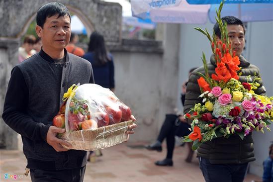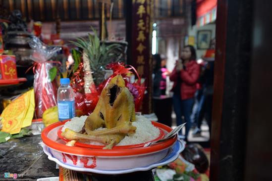 Những mâm xôi gà rất to được du khách kính cẩn dâng lên điện thờ.
