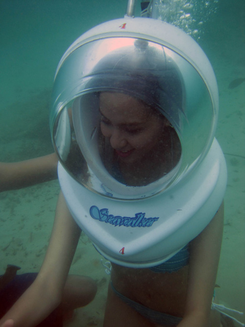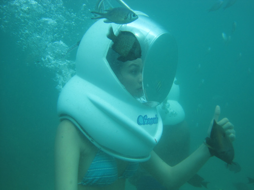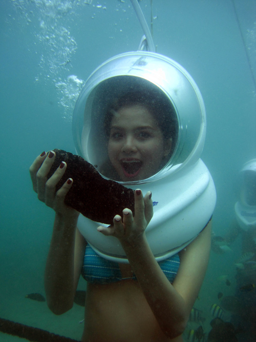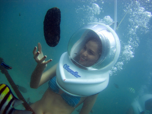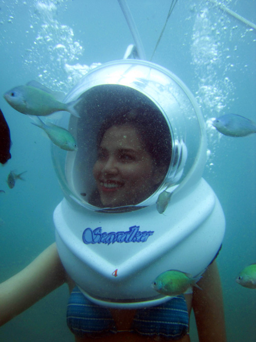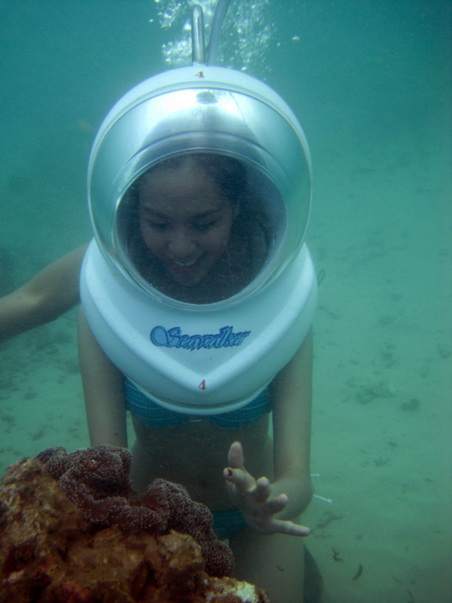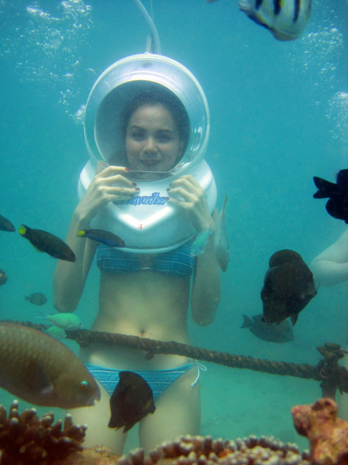 Được nhìn ngắm những rặng san hô đầy màu sắc, chạm tay vào những chú cá lạ, người đẹp vô cùng thích thú và không quên tạo dáng xì tin để ghi lại kỉ niệm này.