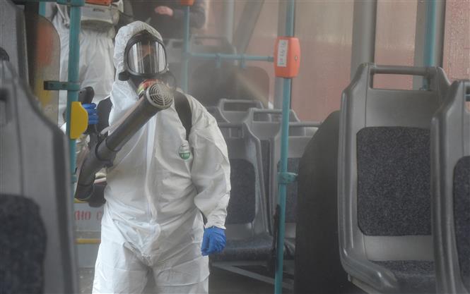 Khử trùng nhằm ngăn ngừa dịch COVID-19 trên xe điện ở Saint Petersburg, Nga ngày 19/3/2020. Ảnh: AFP/TTXVN