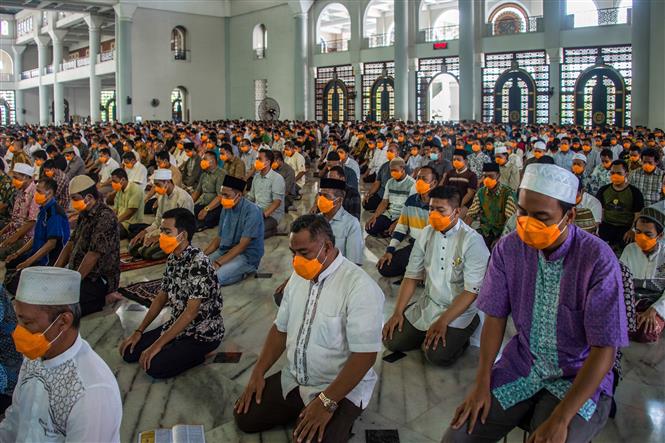 Người dân đeo khẩu trang phòng lây nhiễm COVID-19 trong khi cầu nguyện tại một nhà thờ Hồi giáo ở Surabaya, Đông Java, Indonesia ngày 20/3/2020. Ảnh: AFP/TTXVN