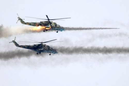 Theo truyền thống, các lính vệ binh là những binh sĩ được huấn luyện tốt nhất. Đến nay, Nga không còn một Lực lượng vệ binh quốc gia như trước nhưng danh xưng vệ binh (Guard) vẫn được sử dụng cho nhiều đơn vị quân đội từ không quân, hải quân và lục quân. Ảnh: Trực thăng chiến đấu đang phóng tên lửa dữ dội trong đợt tập trận của Sư đoàn tấn công đổ bộ đường không 76.