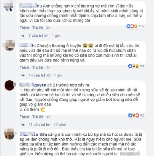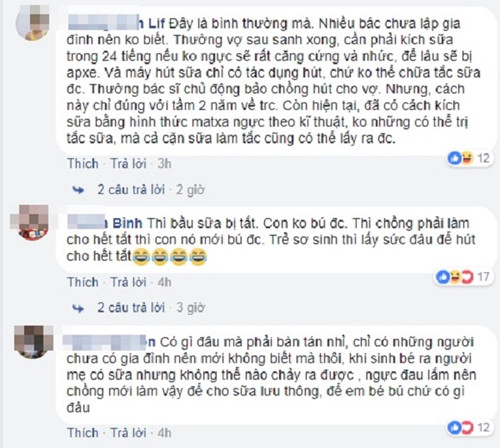 Hay như ý kiến của Ngoc Nguyen: "Có gì đâu mà phải bàn tán nhỉ, chỉ có những người chưa có gia đình nên mới không biết mà thôi. Khi sinh bé ra người mẹ có sữa nhưng không thể nào chảy ra được, ngực đau lắm nên chồng mới làm vậy để cho sữa lưu thông, để em bé bú chứ có gì đâu".
