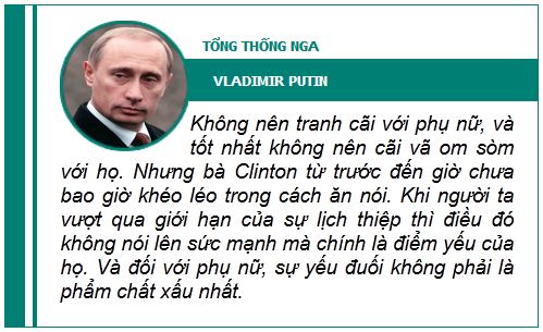 Bà khuyến cáo không nên cố gắng hợp tác và xoa dịu Putin khi thể hiện quá nhiều sự quan tâm tới tổng thống Nga. “Sức mạnh và sự quyết đoán là điều duy nhất mà Putin hiểu được” - bà Clinton nói.